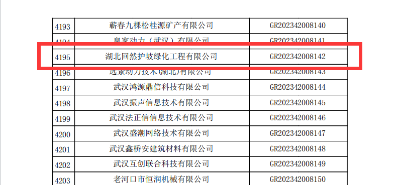 2023年12月8日,全國高新技術企業(yè)認定管理工作領導小組辦公室公布了《對湖北省認定機構2023年認定報備的第五批高新技術企業(yè)擬進行備案的公示》,湖北回然護坡綠化工程有限公司成功上榜,榮獲“高新技術企業(yè)”認定。自此,我司正式邁入高新技術企業(yè)行列。