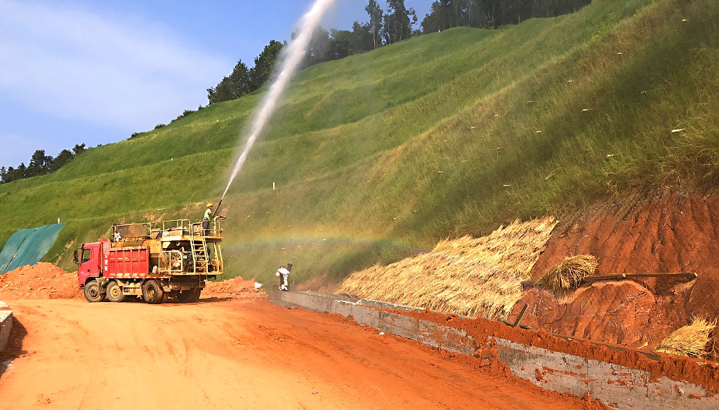 新建猇亭服務(wù)區(qū)路塹邊坡綠化防護(hù)優(yōu)化工程項目-右場坪高邊坡-濕噴機(jī)噴播、噴播車噴播↓