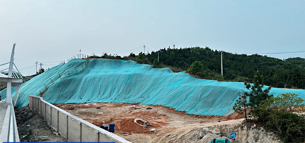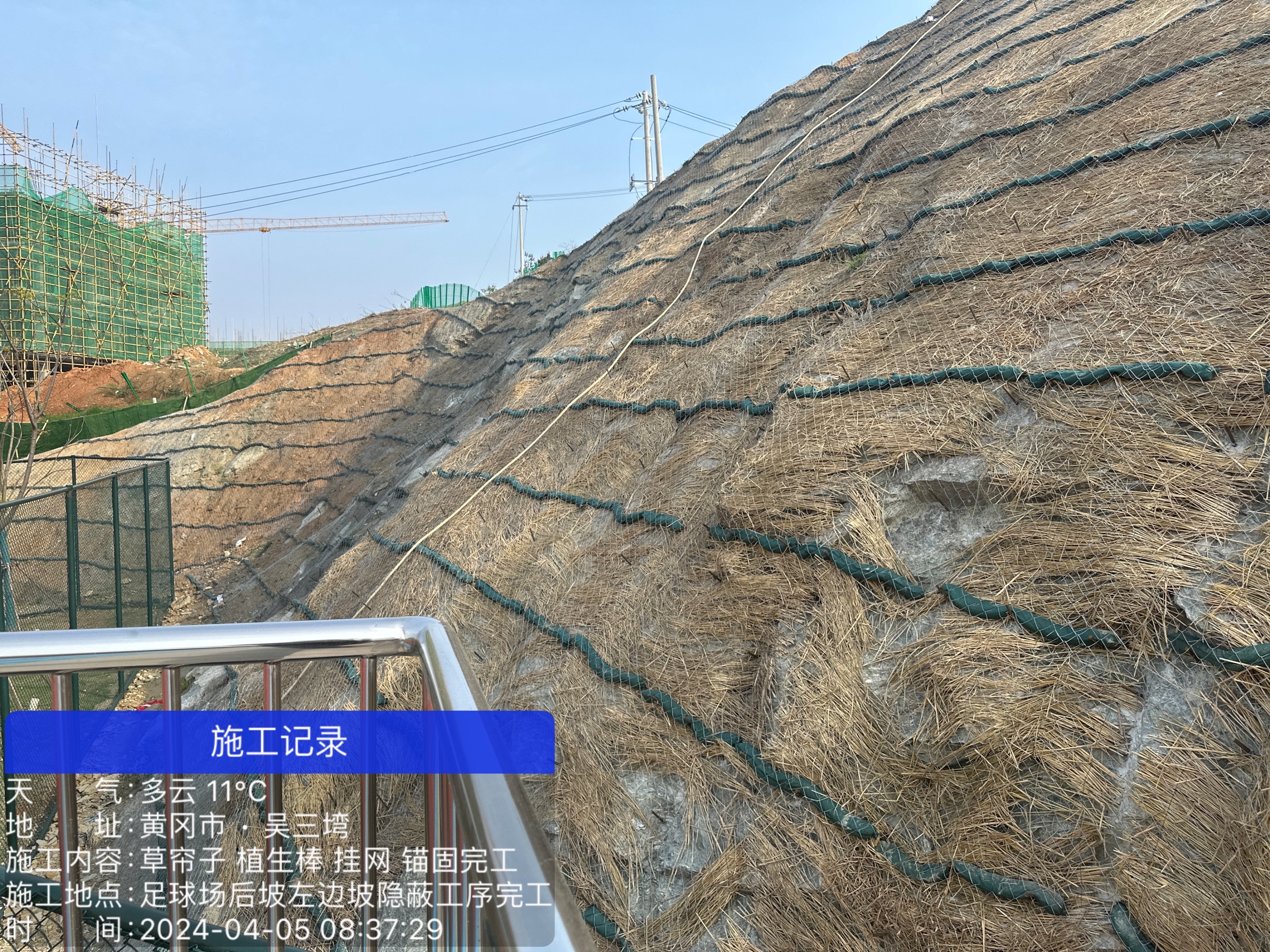 武漢商貿(mào)職業(yè)學(xué)院紅安校區(qū)足球場(chǎng)邊坡綠化工程項(xiàng)目-隱蔽工序(鋪設(shè)草簾、安裝植生棒、掛鋼絲網(wǎng)、錨固)↓